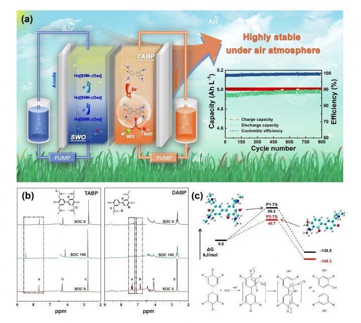Various organic flow batteries based on quinone, ferrocene, TEMPO (2,2,6,6-tetramethyl-1-piperidinyloxy), viologen, phenazine, phenothiazine have been investigated by the structural design over the past decades. Up to now, most of the organic molecules show low redox potential and therefore have been explored as anodes. Only a few molecules display relatively high potential and can be used as cathodes. However, most of them show poor chemical and electrochemical stability. Therefore, the existing organic flow battery systems can normally be operated stably under an N2 or Ar atmosphere. Recently, researchers from the Dalian Institute of Chemical Physics reported an air-insensitive low-cost biphenol derivative (3,3′,5,5′-tetramethylaminemethylene-4,4′-biphenol (TABP)) cathode with high potential and solubility. The TABP is prepared via a simple one-step method. Paring with silicotungstic acid (SWO), an SWO/TABP flow battery shows a stable cycling performance of zero capacity decay over 900 cycles under the air atmosphere. Further, an SWO/TABP flow battery demonstrates a high rate performance with an energy efficiency of 85% and 73% at 60 and 120 mA cm-2, respectively. Also, a high practical discharge capacity of more than 47 Ah L-1 based on the 1 mol L-1 catholyte can be achieved. NMR tests and DFT calculations confirm that the biphenol structure of the TABP molecule has excellent oxidation resistance by a larger ?-conjugated structure, and the four tertiary ammonium functional groups of TABP greatly improve the stability of the TABP by inhibiting the Michael addition reaction.