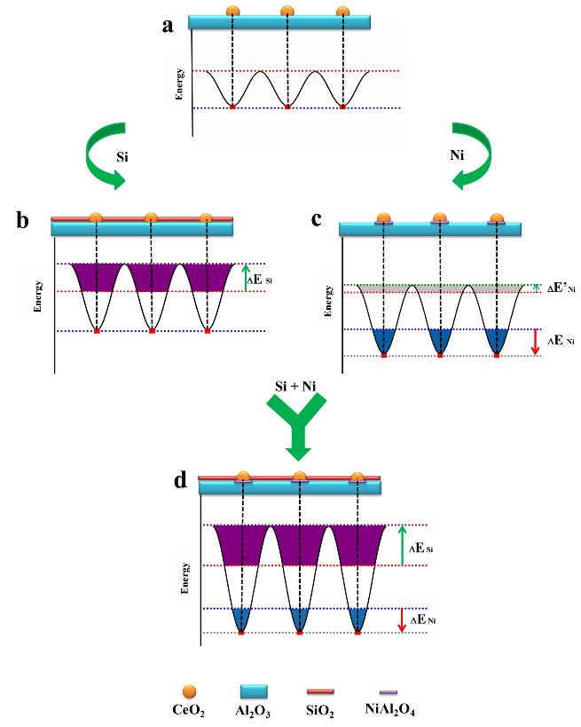 Nano-catalysts usually have higher catalytic activity than traditional bulk catalysts. And it is widely acknowledged that the smaller the particle size of the active component is, the higher the activity would be. However, the active component with small size tends to agglomerate or further grow into large particles. Many reaction processes, such as hydrocarbon cracking and combustion, methane dry/wet reforming and automobile exhaust gas purification, have to be operated at very high temperatures, it will lead to the decreasing of activity and product selectivity due to sintering at high temperatures, ultimately limits the practical application of nano-catalysts. Many researchers believe that the sintering of nanoparticles involves two processes: one is the ripening process, single atom or molecular species move from one particle to another; the other is the migration process, whole particles grow into large particles after migration and aggregation. Because the ripening process can hardly be avoided at high temperature, the current strategy to improve the stability of nano-catalysts is to inhibit the migration of nanoparticles on the basis of “confinement effect” or to construct a “migration barrier”.