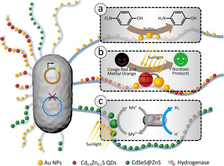 The Zhong group from the Materials and Physical Biology Division, at ShanghaiTech University has made a major conceptual advance in developing a new abiotic/biotic interface towards the integration and immobilization of nanoscale objects with living cells for catalysis. Very briefly, they successfully showed how engineered amyloid monomers expressed, secreted and assembled in the extracellular matrix of living Escherichia coli (E. coli) biofilms can be harnessed to anchor functional nano-scale catalysts to make highly efficient, scalable, tunable, and reusable living catalyst systems. In their proof-of-concept studies, they have demonstrated three simple catalytic systems, including biofilm-anchored gold nanoparticles to degrade the pollutant p-nitrophenol, biofilm-anchored hybrid Cd0.9Zn0.1S quantum dots (QDs) and gold nanoparticles to efficiently degrade organic dyes, and biofilm-anchored CdSeS@ZnS QDs in a dual bacterial strain semi-artificial photosynthesis system for hydrogen production. As revealed in their studies, the extracellular matrix in biofilms indeed provides an ideal milieu for interfacing and anchoring nano-objects for direct catalysis and for their integration with the metabolism of living cells: even after multiple rounds of reactions, nano-catalysts were still robustly anchored to biofilms and the E. coli cells were still alive for easy regeneration. Importantly, such an approach would open up the extremely powerful and unique attributes of living systems.