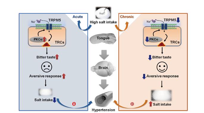 Salt taste perception is an important factor in determining salt intake at an individual level. Previous studies have shown that aversion induced by salt beyond the physiological concentration range is mediated by a bitter taste sensor-transient receptor potential channel M5 (TRPM5) in taste receptor cells. High salt stimuli might produce a bitter taste for a defensive response to reduce salt intake. Recently, Professor Zhiming Zhu’s team from Army Medical University found that acute high-salt stimulation activated TRPM5-mediated bitter taste and increased aversion reaction. However, long-term high salt intake impairs the activity of the TRPM5 by inhibiting protein kinase C (PKC) activity and PKC-dependent threonine phosphorylation. “The TRPM5-mediated aversion response to high salt is weakened, which results in a progressive increase of high salt intake and increased blood pressure in mice fed with long-term high-salt-diet.” Said Dr. Yuanting Cui, the first author of this work. These results were published in Hypertension recently.