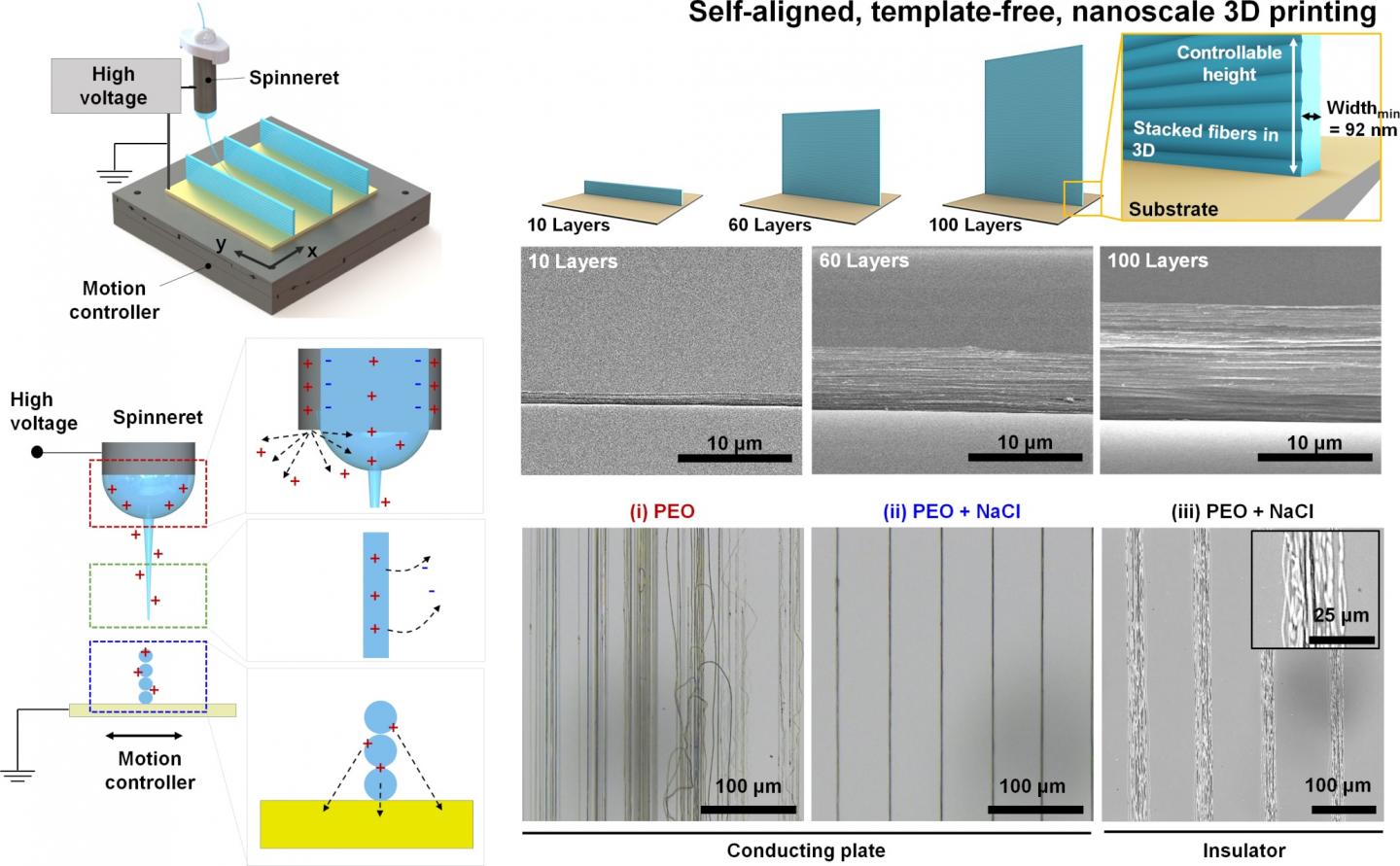 IBS researchers were able to achieve a better control of the nanofiber deposition on the platform, by adding an appropriate concentration of sodium chloride (NaCl) to the polymer solution. This ensured the spontaneous alignment of the nanofiber layers stacked on top of each other forming walls.