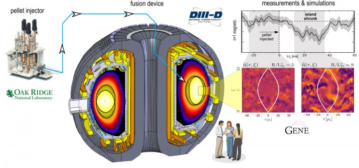 Recently, however, researchers at the DIII-D National Fusion Facility in San Diego discovered a new way to eliminate islands. They observed that firing frozen pellets of the hydrogen isotope deuterium deep into the plasma causes the magnetic islands to shrink. Using computer simulations, they determined that the shrinkage was likely caused by increased turbulence in the plasma due to the injected pellets (Figure 1). Theoretical calculations show that the shrunken islands can be completely eliminated with 70 percent less current inside the island than what is normally needed without the help of pellet injection.