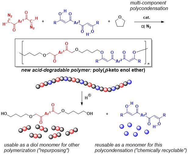 The polymerization catalyzed by a Rh catalyst proceeded as they expected, affording poly(β-keto enol ether) with a molecular weight higher than 10000. More importantly, the polymer was found to be cleanly degraded into a combination of two low molecular weight compounds in high yield under mild acidic conditions; one of the degraded products was the monomer itself, bis(1,3-diketone) (indicating recyclability of the monomer), and the other one was a dihydroxy compound derived from the bis (diazocarbonyl) compound and THF used as other monomers.
