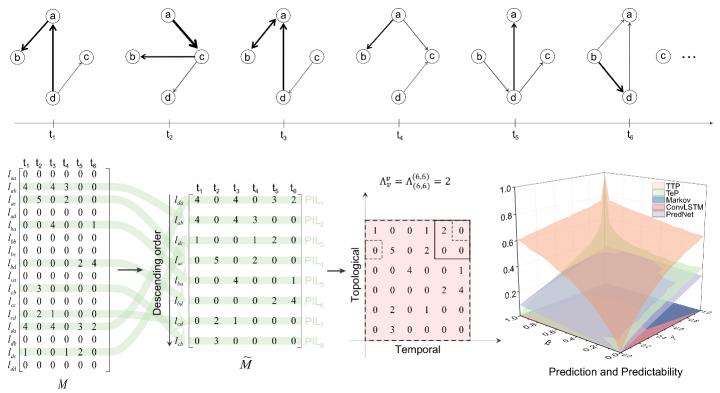 The authors mapped any given network to a temporality-topology matrix, and then extended the classic entropy rate calculation (that is only applicable to square matrices) to arbitrary matrices through regression operators. The significant advantages of this temporal-topological predictability were validated in two typical models of temporal networks. Applying the method to calculate the predictability of 18 real networks, the authors found that in different types of real networks, the contributions of topology and temporality to network predictability are significantly variable; Although the theoretical baseline and difficulty of temporal-topological predictability are much higher than that of one-dimensional time series, the temporal-topological predictabilities of most real networks are still higher than that of time series.