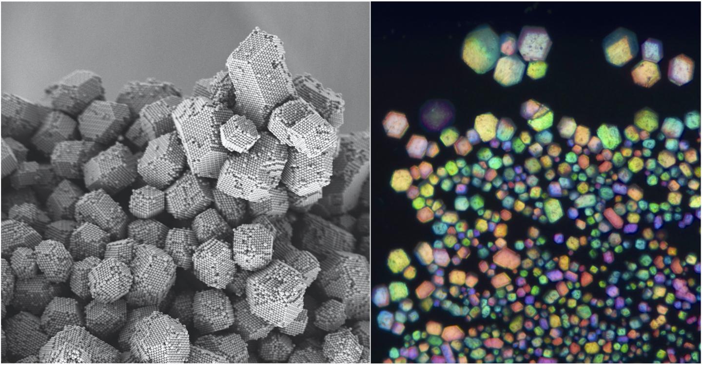 In addition to creating salt-like colloidal materials, the researchers used self-assembly to create colloidal materials that mimic gemstones–in particular, opals. Opals are iridescent and colorful, a result of their inner crystalline microstructure and its interaction with light. In the lab, the researchers created their test-tube gemstones with very similar inner microstructures to opals.