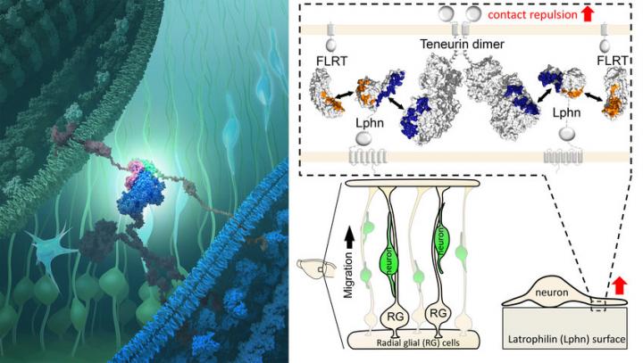 The three proteins Teneurin, Latrophilin and FLRT hold together and bring neighboring neurons into close contact, enabling the formation of synapses and the exchange of information between the cells. In the early phase of brain development, however, the interaction of the same proteins leads to the repulsion of migrating nerve cells, as researchers from the Max Planck Institute of Neurobiology and the University of Oxford have now shown. The detailed insight into the molecular guidance mechanisms of brain cells was possible due to the structural analyses of the protein complex.